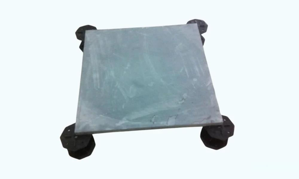 Peça de apoio instalada no topo do pedestal que sustenta e distribui o peso entre os quatro painéis adjacentes do piso elevado